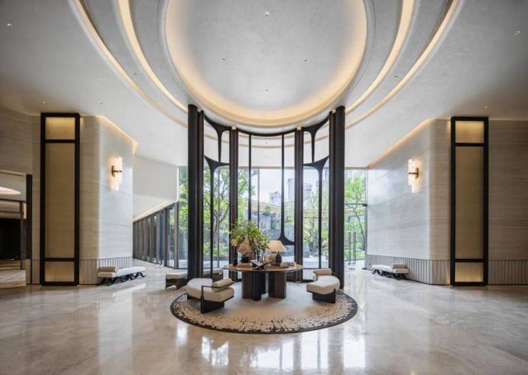 设计通过层层退台的空间布置形式,以游廊的方式串联起各层的功能分区,恒温泳池、健身空间、私宴厅……赋予生活更多的清新意趣。同时,将传统园林的空间手法转移到公区内部,让建筑在自然中自由延伸,带来移步异景的多维视觉享受;迂回的游园动线,也在有限的空间中,丰富了社交和休闲的场所与体验。立体灵动的游园系统,创造出一种山水交融的社区环境,也保障了社区的私密性和安全性。