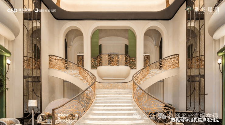 穿过大门就进入了挑高约10米的中庭,这里也是会所的接待大堂,借鉴了厦门千万级豪宅宸启瑞湖的海派美学基因。花瓣式艺术吊灯、南洋釉彩地砖、Art Deco珐琅彩玻璃、双向旋转楼梯......每一处细节,都是对卓越品位的精准表达。