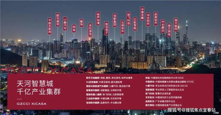 天河智慧城汇聚阿里巴巴、网易、酷狗、小鹏汽车等2500多家科技企业、1000多家高新技术企业,构建八大产业集群,2023年总收入达1341亿元,引进20多万技术人才,“广州硅谷”孕育而生,成为湾区科创精英宜居宜业之地。