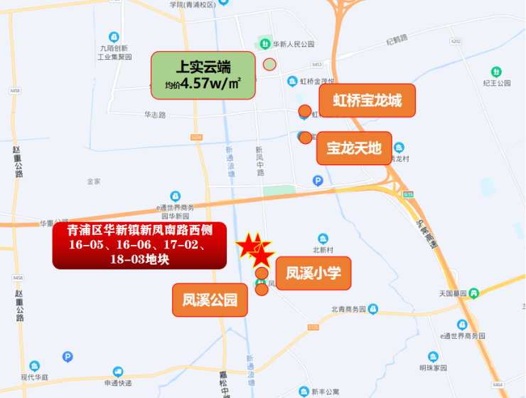 项目地块位于青浦区华新板块,周边暂无轨道交通,商业有虹桥宝龙城、宝龙天地,学校有凤溪小学等。项目周边新房有上实云端,均价4.57w/㎡。
