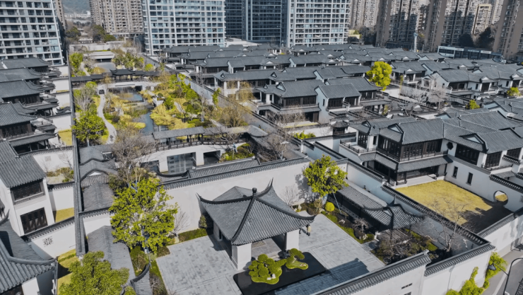 - 建筑风格:纯正两层中式合院,融合江南粉墙黛瓦与传统回纹、木窗棂元素,门洞造型与灯具(杨桃灯)均为专利设计(专利号:ZL202130810538.X)。