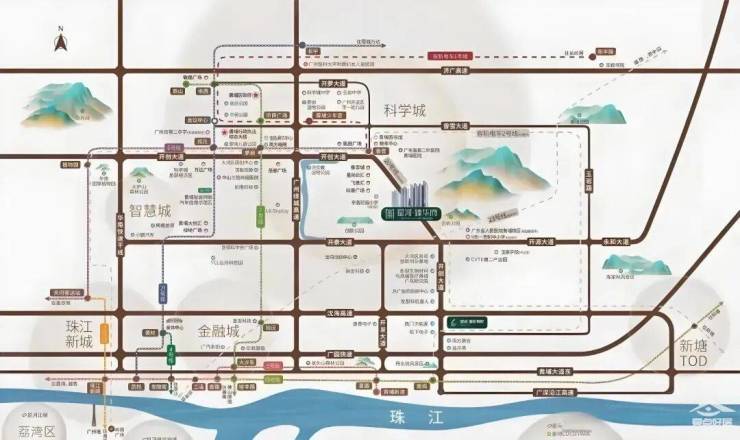星河臻华府位于开创大道与开源大道交汇处,在科学城板块占据着不错的地理位置。东至湖麻山,西至植树公园,北至罗坎村,周边自然环境优越,被山水环绕,居住起来空气清新,环境宜人。