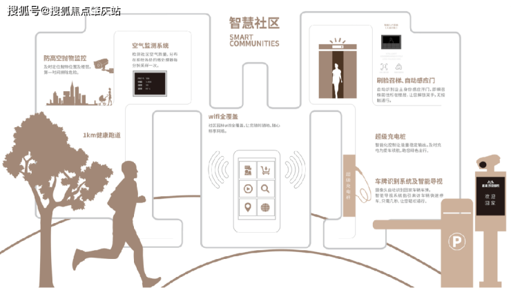 高标准智能家居:实现刷脸入户、一键召梯,园区内WIFI全覆盖,安防报警系统、火灾报警系统等