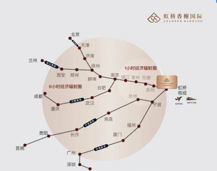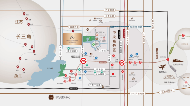 交通配套方面:以远见占位,纵享高效交通体系,20 分钟直达虹桥枢纽,1 小时辐射长三角重点城市,2-6 小时直达国内主要城市。