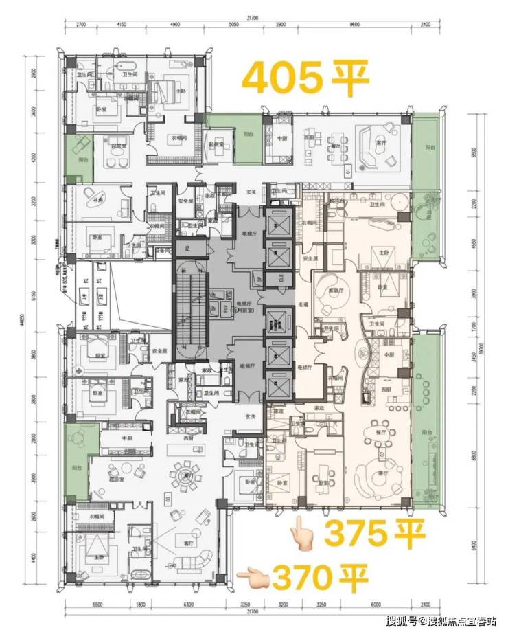 高区(42层起,150-200米):约370-403㎡ 4+1房五卫,带家庭厅及家政套间。
