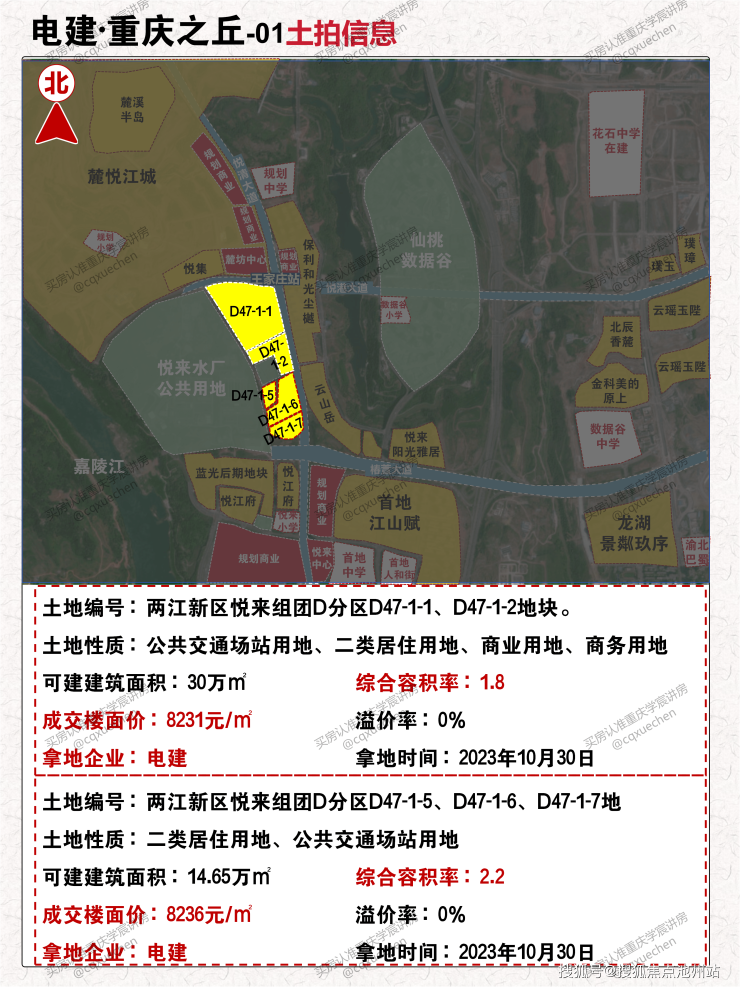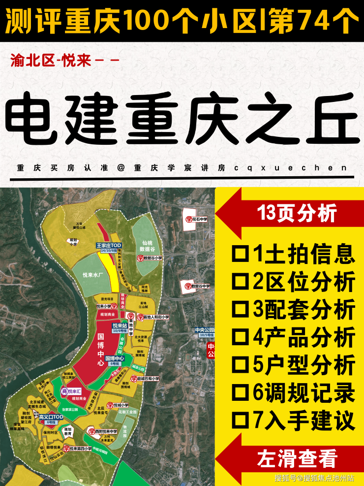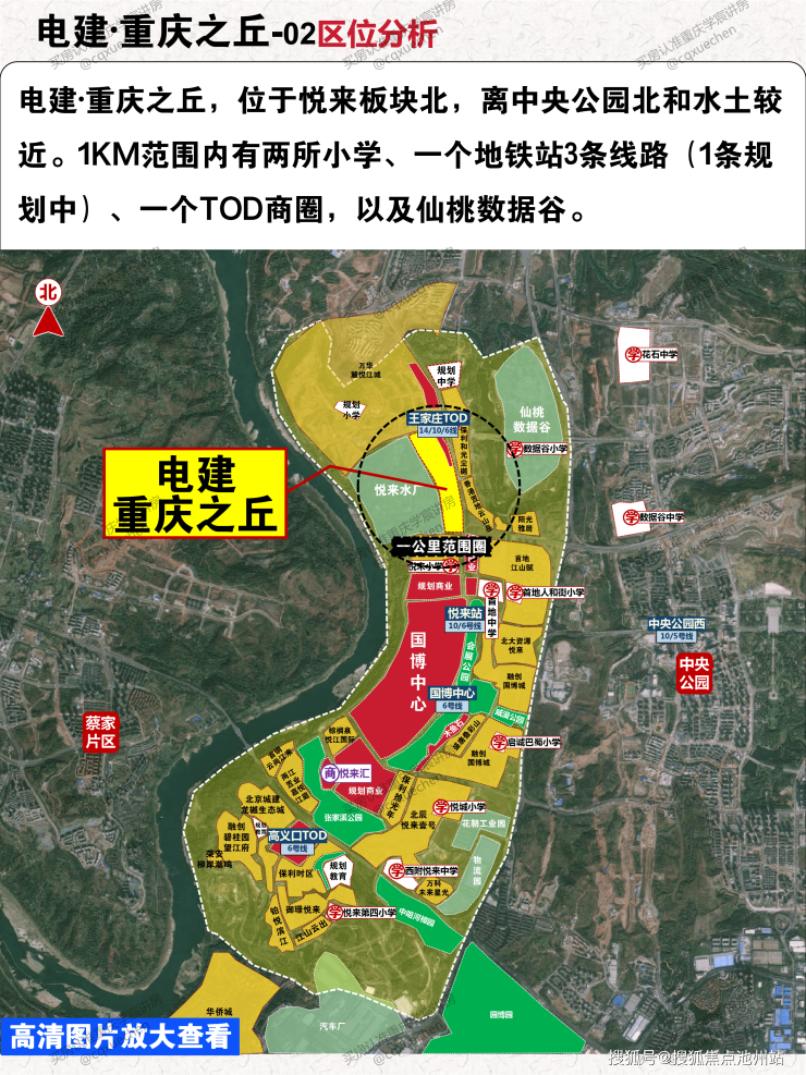 电建·重庆之丘,位于悦来板块北,离中央公园北和水土较近。1KM范围内有两所小学、一个地铁站3条线路(1条规划中)、一个TOD商圈,以及仙桃数据谷。