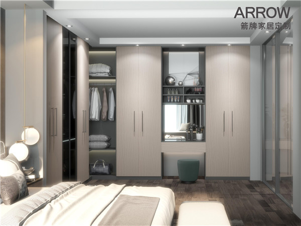 最后应该感谢的是我们的卧室,对于生活节奏快的现代人而言,卧室不仅是奔波灵魂的栖息地,亦是忙碌生活的落脚港湾,只有在这里做好充足的休息放松,才能恢复精神迎接第二天的工作生活,能给以更完善的状态才能给予未来生活无限的包容和可能。能抚平内心焦虑和不安的箭牌家居定制希曼系列,其莫兰迪色系与深灰的碰撞营造出空旷的空间融合感,再加上饱满润泽的细腻线条尽显优雅的极简轻奢风的L型衣柜空间,打造出一个自由放松的私密空间,让你可以尽情享受愉快的时光。而衣柜与梳妆台相结合的加分设计,构成功能齐全的衣帽间空间,则是体现了箭牌家居定制既有用心,又有匠心的专业设计能力,增加产品空间的通透性的同时,让每一寸空间得到充分利用,用虔诚来感恩家是我们心灵永远的港湾。