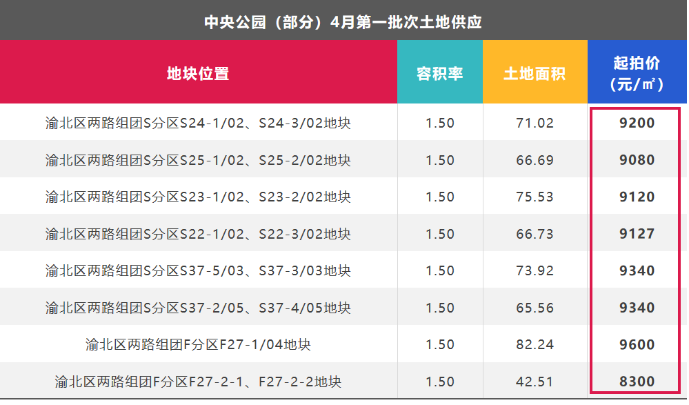 单论中央公园今年的土地起始价,较低8300元/㎡;较高9600元/㎡。