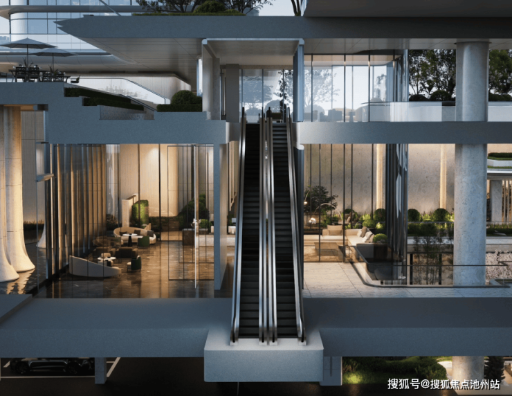 入户高线公园与连廊飞梯,是生机之环竖向激活的关键生长脉络。入户高线公园引绿意向上漫延,让美好在步履进阶间持续生长。连廊飞梯串联多重意境,拾级而上时,视线于庭院秀色与江天浩渺间悠然流转,共同解锁垂直生长的社区新境。