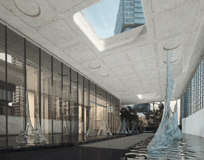 生境山谷延续云梦翠谷灵感,是生机之环的核心生态空间。四层垂直绿意层叠交织,约13米落差的云梦叠瀑倾泻而下,实现罕见叠水中庭贯穿地面与负二层,阳光空气涌入,彻底消除地下与户外边界。