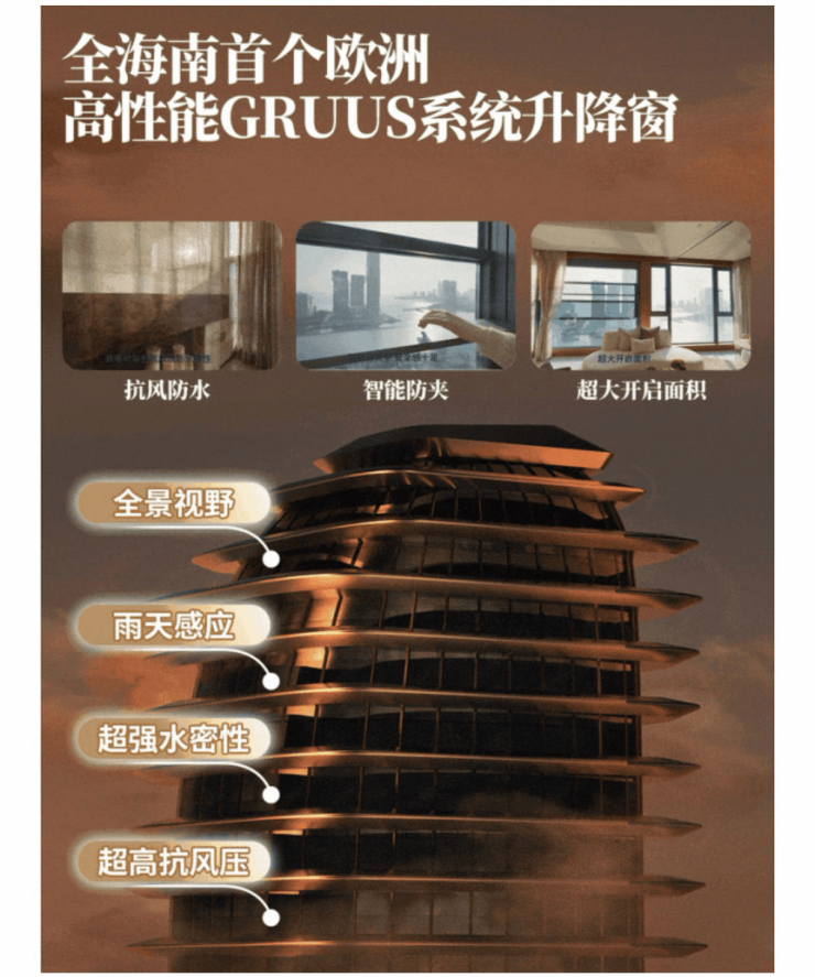 凤栖壹湾首次在海南引入意大利进口GRUUS电动提升窗。GRUUS承袭法拉利御用设计基因,斩获红至尊大奖,集多项黑科技于一体,一键开启无界海景。