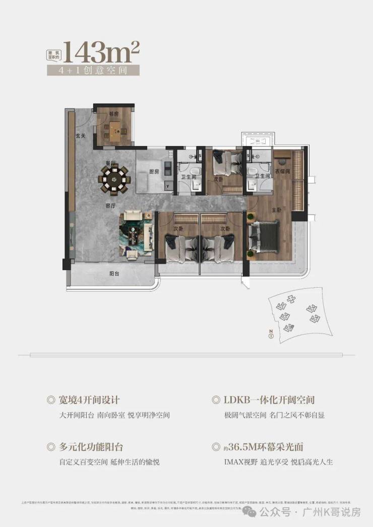 D栋-143㎡户型,南向宽景4开间设计 | 约36.5M环幕采光面 | 270°环幕瞰景主卧|多元化功能阳台