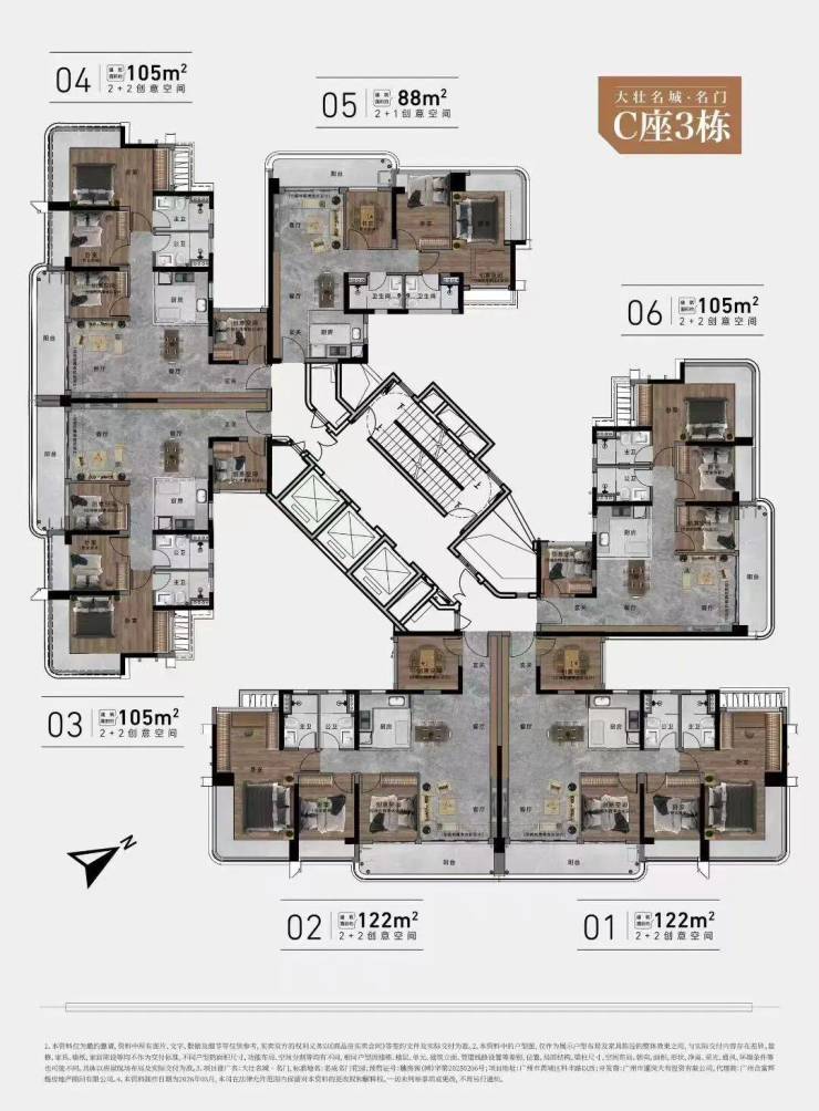 6个户型,朝向分别为:88平朝西北,2个105平朝西南,122平和143平朝东南,还有一个105平朝东北,不分户型大小,全都是3.05米层高