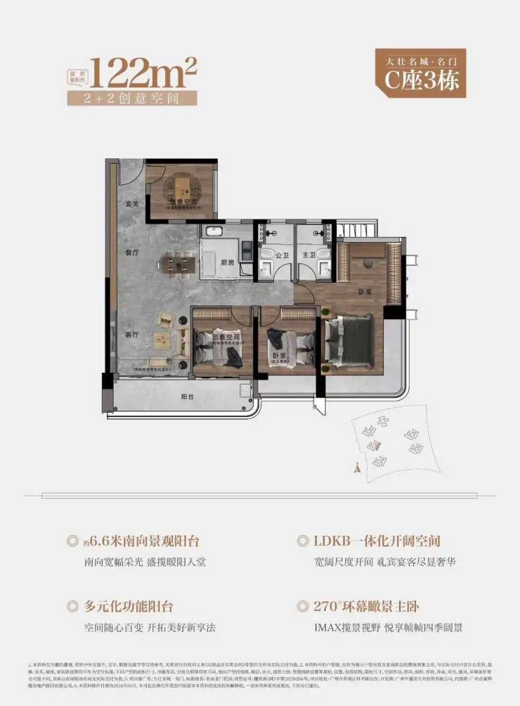 105㎡户型,约6.1M巨幕阳台 | 270°环幕瞰景主卧|LDKB一体化设计