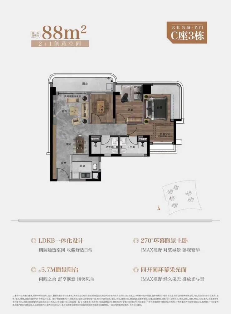88㎡户型,约5.7M巨幕阳台 | 270°环幕瞰景主卧|LDKB一体化设计