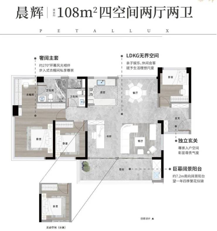 ·108㎡户型更以15米南向超大面宽对标豪宅,7.2米南向巨幕阳台+LDKG无界空间,孩子在客厅搭积木,母亲在中岛台准备点心,父亲在开放式书房处理工作,视线交汇间满是互动的暖意,改善家庭的体面与温馨在此尽显。