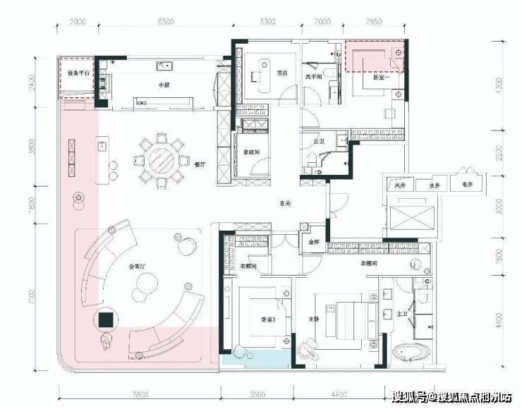 以项目建面约261㎡四室两厅三卫大平层为例。