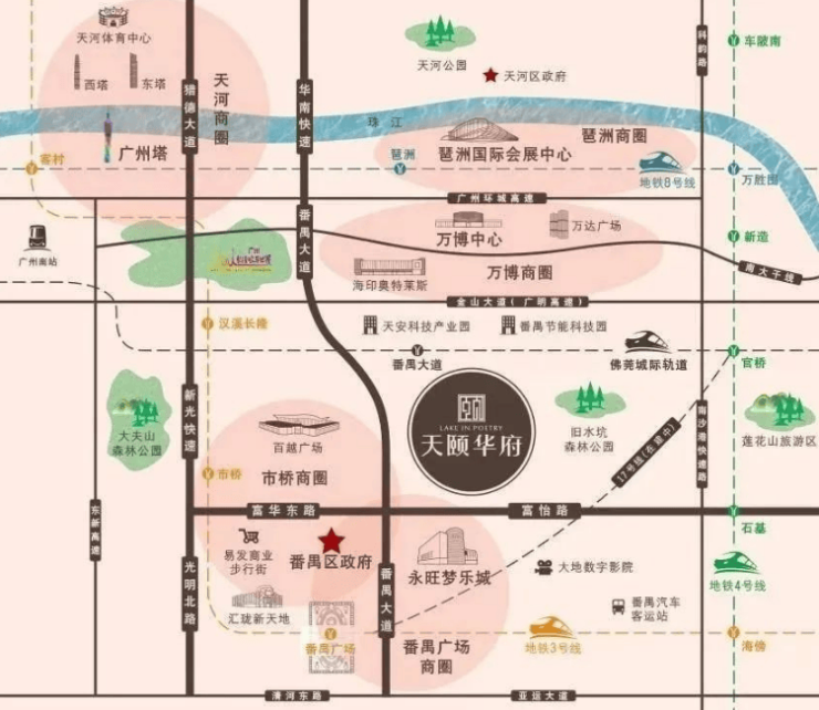 番禺广场、万博商圈 + 广州南站 + 广州国际科技创新城,三者交汇筑就番禺城央黄金三角区域。
