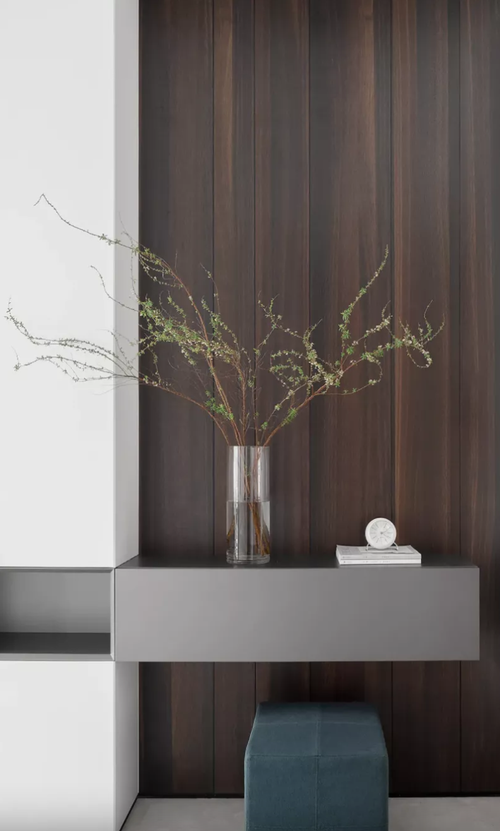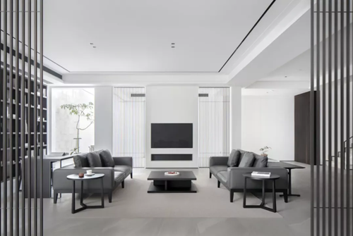 在剔除了多余的装饰后,设计师选择与整体布局相搭配的纵行格栅,虽是单一的造型,却以不同形态出现,统一而多变,空间的灵动感就此体现。