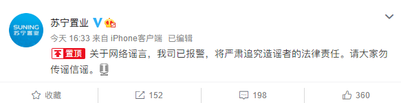 今日,有网传消息称,苏宁置业7月2日将宣布破产,苏宁易购及物流阿里接盘持股40%,35岁以上L10以下员工将被裁员。苏宁置业在官方微博表示,“关于网络谣言,我司已报警,将严肃追究造谣者的法律责任。请大家勿传谣信谣。”