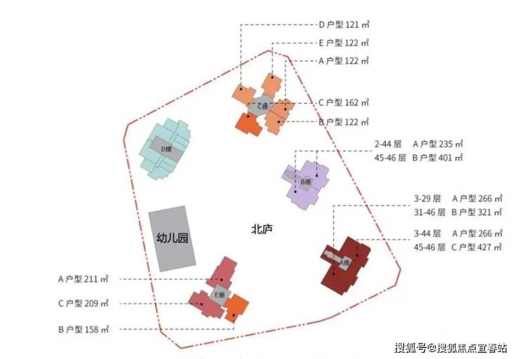 北庐住宅户型:建面约210㎡、235㎡、266㎡、322㎡,410-470㎡(顶复)