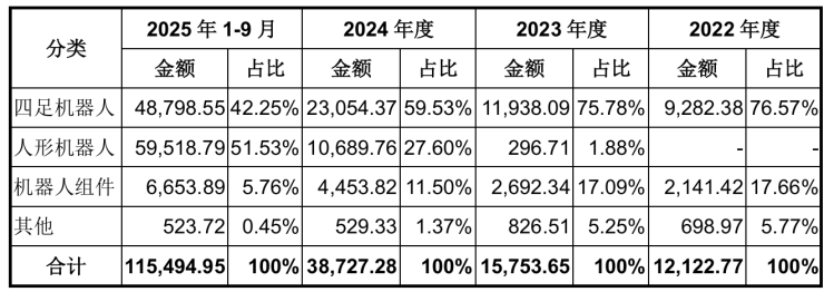 以去年前三季度看,人形机器人营收达5.95亿元,而2024年还仅有1.07亿元,可谓增长迅猛,占比从不到28%快速提升到52%,首次超过四足机器人42%的占比,成为宇树第一大业绩主力。不过,四足机器人过去几年也依然持续增长。