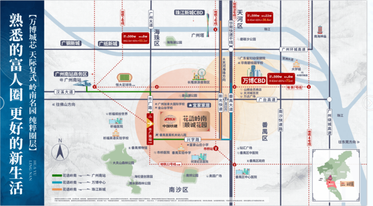 项目立足于已有二十年发展的华南板块,南站商圈、万博商圈、长隆商圈三大商圈覆盖,成熟配套包罗万象;项目打造为岭南书香门第府邸,周边学府环绕。