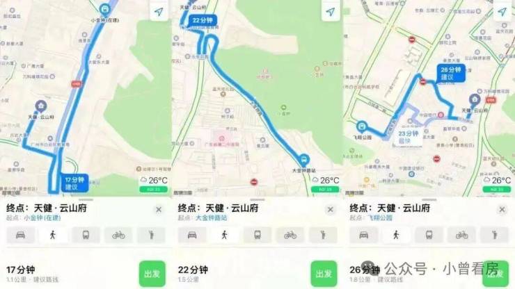 此外,天健·云山府位于白云新城城芯处,还肩负着从北进入越秀区、天河区、荔湾区的门户口岸位置,有着三地铁汇聚的立体交通网络,目前距离项目约1km是2号线白云公园站和地铁11号线大金钟站(正在建设中,预计今年将会开通),同时还规划有地铁12号线的小金钟站距离项目仅仅约400m(预计今年开通)。