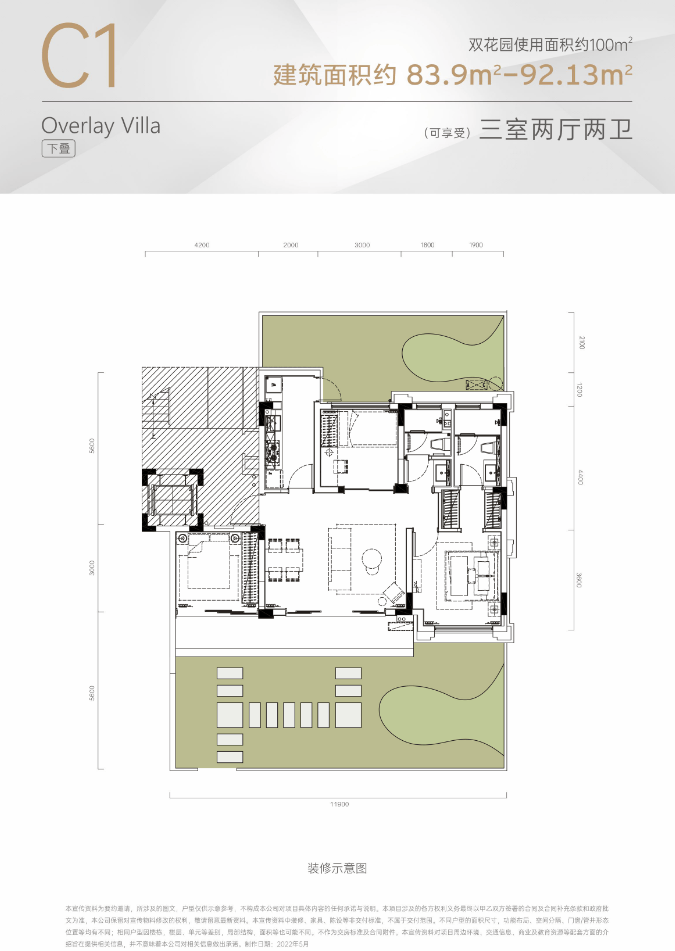 C1户型:一楼93平 三室两厅两卫 带前后双花园 前65平 后35平