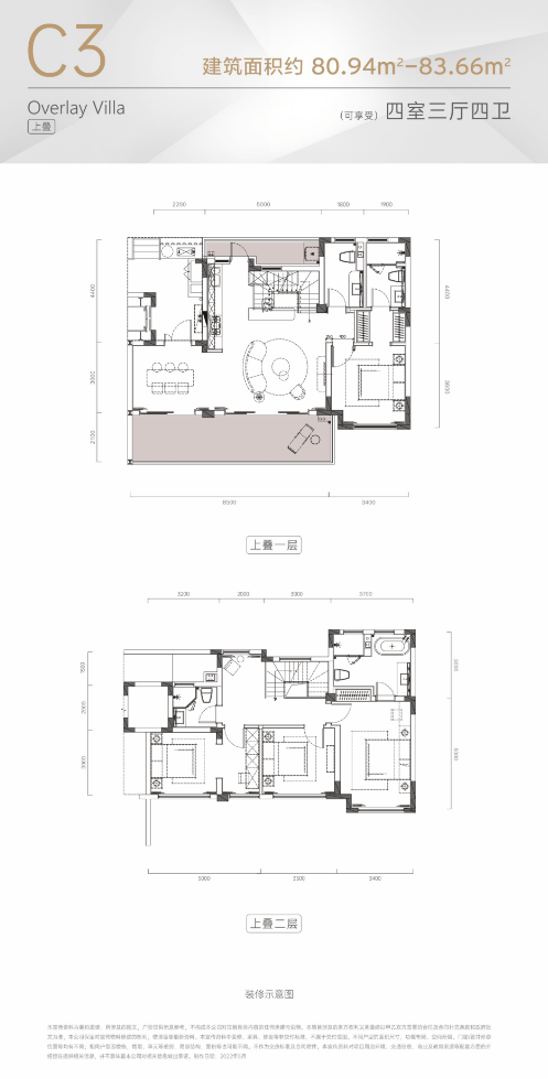 C3户型:三楼83平 买三楼送四楼阁楼 实得160平 四室三厅四卫