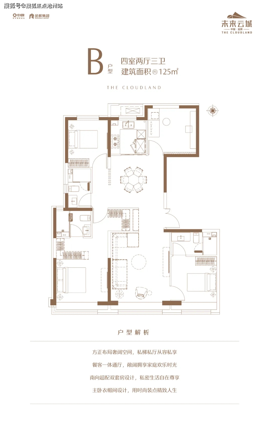 B户型为125㎡四室两厅三卫的方正四居,该户型布局方正、南北通透,明厨明卫、双卧和客厅均朝阳,居住更舒适。北侧为两个次卧中间有厨房相隔,每个卧室均不相邻,保证了每个房间的隐私,互不打扰。南向少有的超配双套房设计,主人和老人都可以有舒适的私密生活。且主卧还有配套的步入式衣帽间,给主人带来更精致的生活。