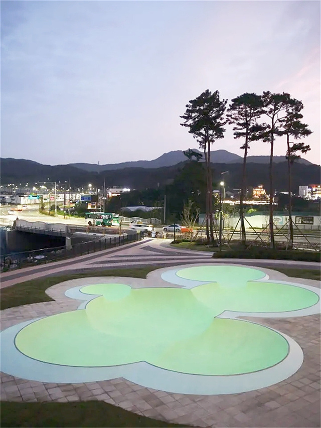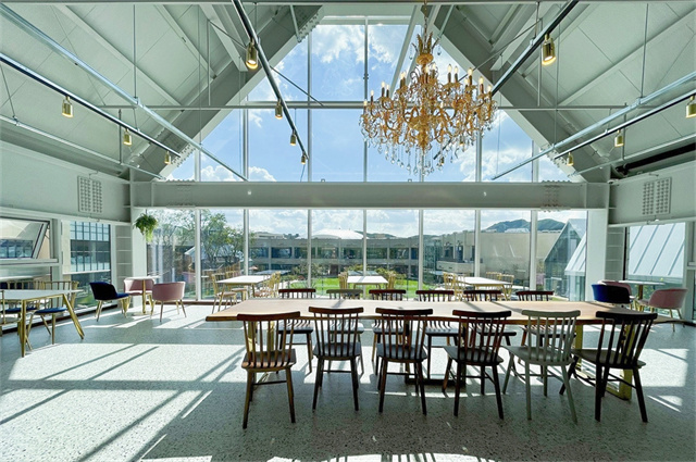 THE STATION是一个300㎡的圆形迎宾广场,抬头望去是一个30米高玻璃穹顶,也是韩国国内首次采用开合顶棚的设计。迎宾广场借助多边联通的台阶不仅能够贯通奥特莱斯时光别墅的各个区域,还通过与自然光线穿过圆形玻璃结构的视觉融合,提高空间的广阔开放感。