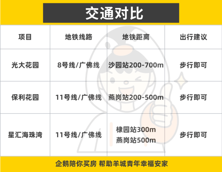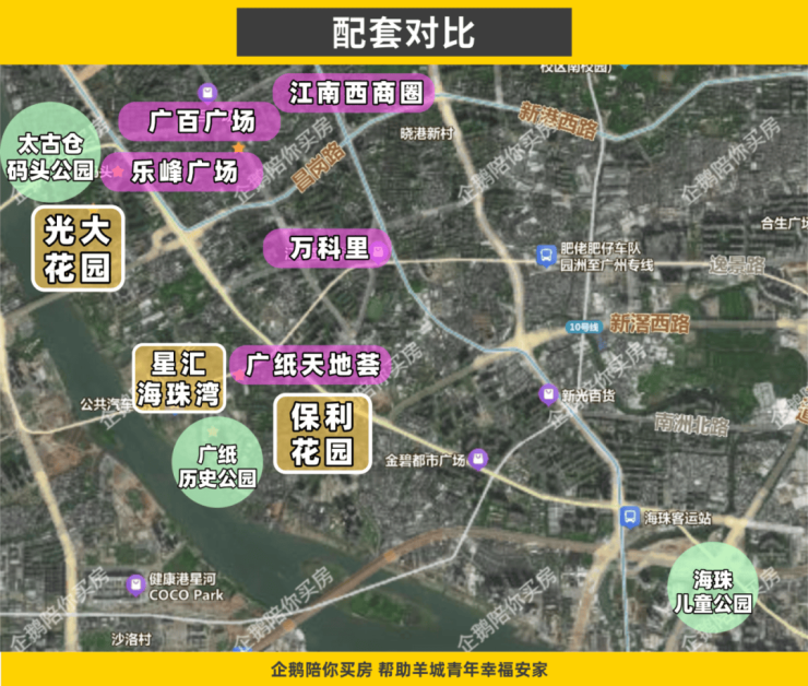 配套方面,光大花园更靠近海珠西的核心商圈,大型商业盒子乐峰广场直接开在家门口,江边还有充满小资情调的太古仓码头。星汇海珠湾和保利花园所在的广纸板块就相对逊色一些,但距离海珠西其他核心商圈也就是两三个地铁站的距离不远。