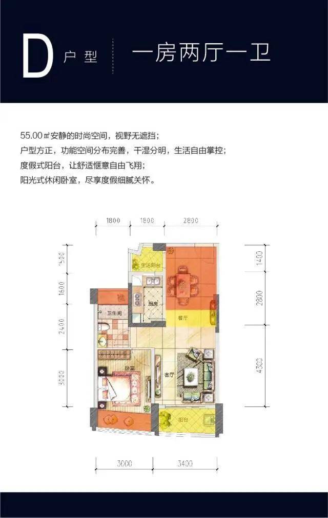 55.00㎡舒适安静的时尚空间;户型方正,功能空间分布完善,干湿分明,生活自由掌控;度假式阳台,让舒适惬意自由飞翔;阳光式休闲卧室,尽享度假细腻关怀。
