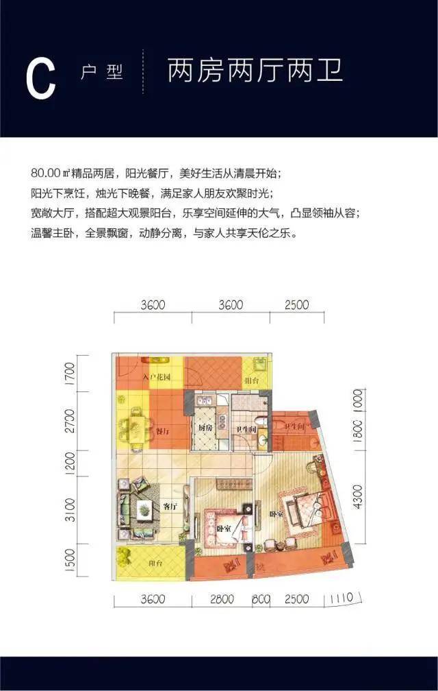 80.00㎡舒适两居,阳光餐厅,美好生活从清晨开始;阳光下烹饪,烛光下晚餐,满足家人朋友欢聚时光;宽奢大厅,搭配超大观景阳台,乐享空间延伸的大气;宽敞主卧,独立观景阳台,动静分离,与家人共享天伦之乐。