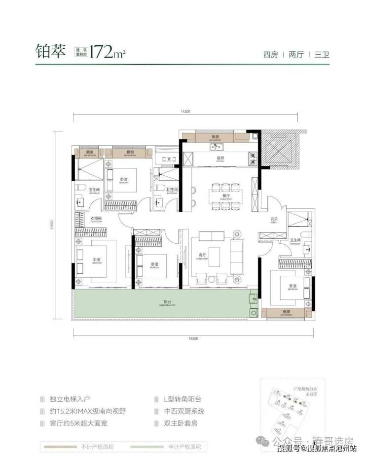独立电梯入户,约15.2米IMAX南向视野,客厅约5米超大面宽,中西双厨,270°转角阳台,双主卧套房,实在是太豪横。