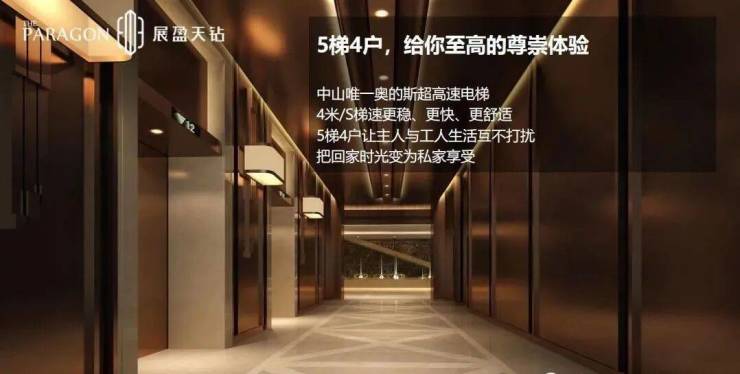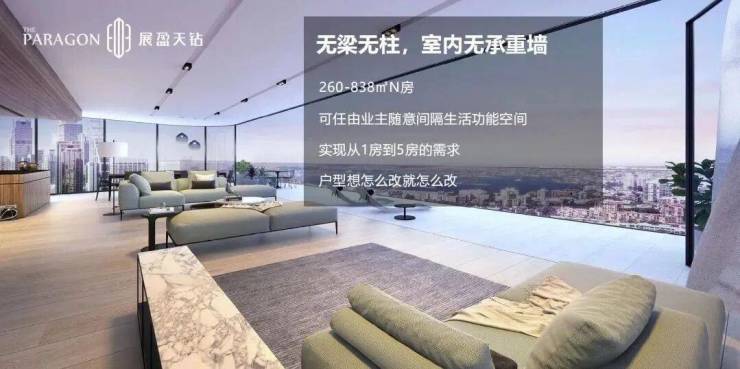 室内无梁无柱、无承重墙的宴会厅式室内设计,让260至838平方米的平层空间可任由业主发挥创意,随意间隔生活功能空间。此外,单位标准层高达3.7米(部分顶层单位的楼高甚至达到6.9米),造就中山难得一见的超级大平层。