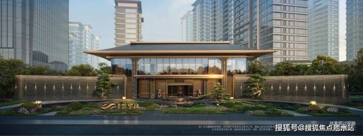 观澜屏玻璃立面映照江波,香槟金格栅勾勒鎏金气质,黄金缕线条灵动飘逸,以现代手法演绎东方飞檐意境,重塑滨江天际线。