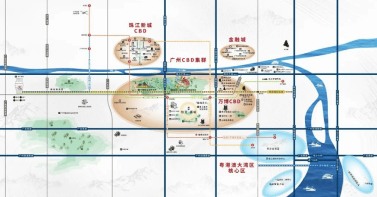 香江 1 号位于番禺大道北与朝阳东路交汇处,属于番禺大石板块,直线距离珠江新城约 10 公里,开车走新光快速,非高峰期 25 分钟左右能到天河。对于在天河、海珠上班的人来说,这个位置算比较折中,比住南沙、增城通勤时间更可控。周边有长隆旅游度假区、万博商务区等,生活配套和就业机会都比较丰富。