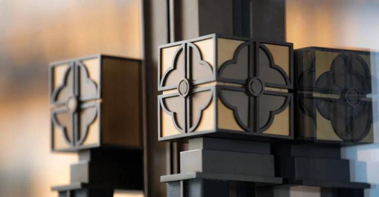 套方锦纹有四方形、十字、八角等图案,代表形正心正,寓意正直、吉祥。我们抽象提炼以现代几何体块穿插建构,有序中正,选材以回纹金属的厚重与夹丝玻璃的轻盈对比。