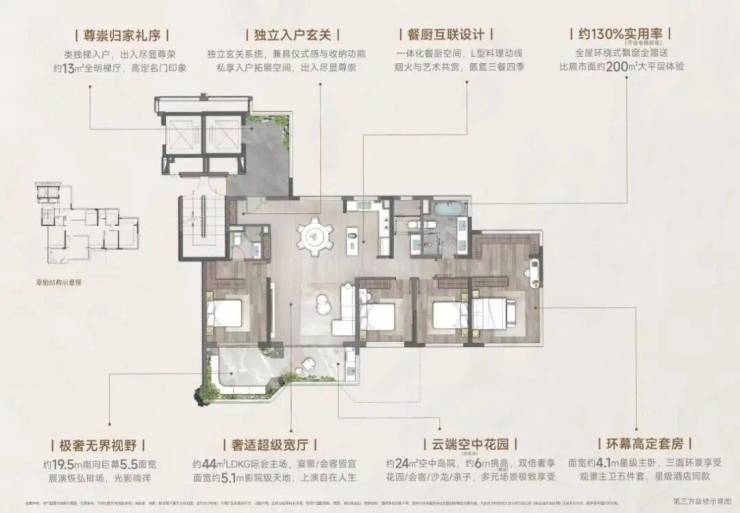 【139㎡云颂】以约44㎡无界宽厅划写天际线,约19.5米环幕视界打破空间桎梏。奢适主卧套间三面环景,270°环幕飘窗私藏四时光影,以约139㎡空间容器承载约200㎡奢居想象;