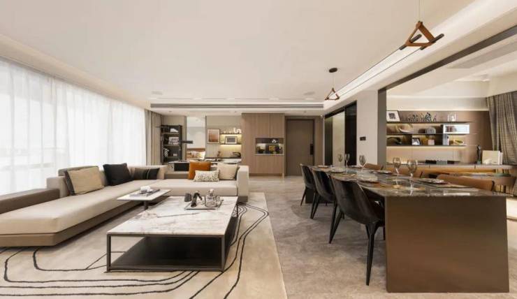 在设计美学与功能主义的双重追求下,武珹云府的南厅户型实现了约50㎡的阳光大方厅。客厅、厨房和餐厅的空间连通,让生活更加畅通无阻。这里不仅可以承载家庭的生日派对,还能在关照不同家人作息习惯的同时,保持一种亲密的姿态。
