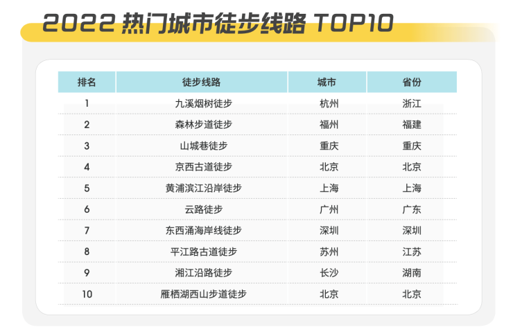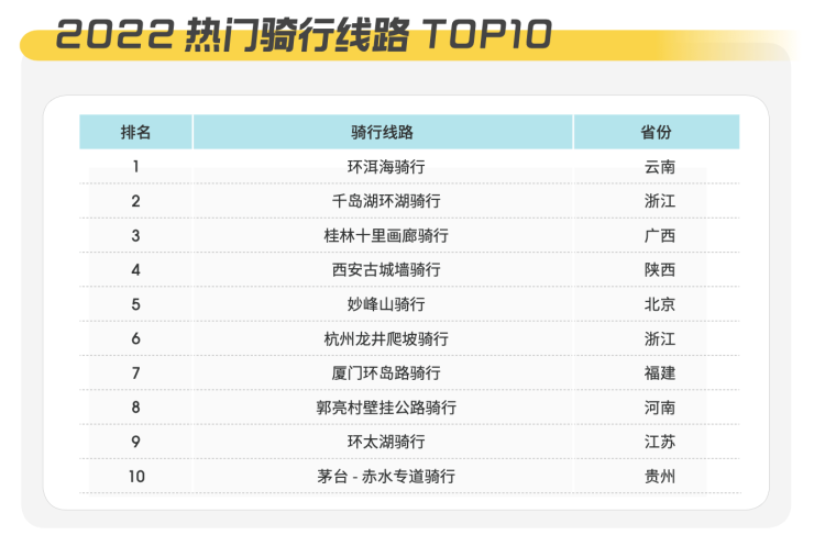 骑行也是今年风靡年轻群体之间的户外项目。CLUB100 创始人邹成认为,集运动、休闲和文化体验于一体的骑行运动的风行,与城市发展水平息息相关,目前北京和上海仍然是骑行运动的重镇。这里完善的城市绿道,可供骑行的公园及周边丰富的景区资源为骑行提供了良好的环境。马蜂窝旅行玩乐大数据显示,2020年至今,平台上关于骑行的数据已经增长108%,除了上班族的短程接驳,越来越多的年轻人周末去博物馆打卡、去网红店吃早午餐,都愿意选择骑行。报告显示,2022年热门骑行线路前五名分别是环洱海骑行、千岛湖环湖骑行、桂林十里画廊骑行、西安古城墙骑行、妙峰山骑行以及龙井爬坡骑行。