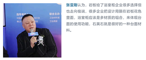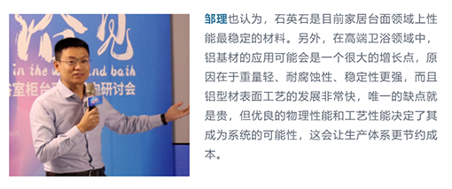 法萨董事总经理邹理介绍了石英石在浴室柜中的应用发展历史。他表示,法萨石英石从颜色的日益丰富,到模仿天然石,到加入艺术元素,再到对表面肌理和质感的优质追求,最后到性能与应用的延伸,未来会走向怎样的可能?他希望从大家的共同探讨中得到启发。