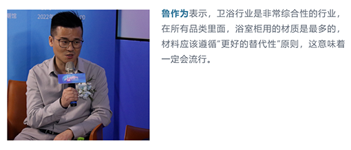 鲁作为从设计风格、颜色、材质、功能四个方面进行一一阐述。他表示,浴室柜流行的是轻奢、极简、新中式,因为与现在主流装修风格搭配融合;黑白灰能体现意式极简,而莫兰迪、蓝色、橙色等多种色彩的点缀令浴室家居产品更加活跃与温暖人心;材质多样化才能体现更多风格,给消费者带来不一样的感受;功能与美学相结合,温暖人心的功能设计是浴室柜较大的趋势。