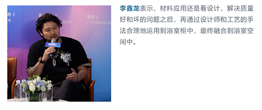 对此观点,李鑫龙表示赞同,他认为,行业发展到现在,各类风格都经历了一轮,市场不可能满足每个人的消费习惯,如何通过空间设计把材料应用得更好,符合当下市场和年轻人的爱好,是浴室柜行业需要思考的问题。
