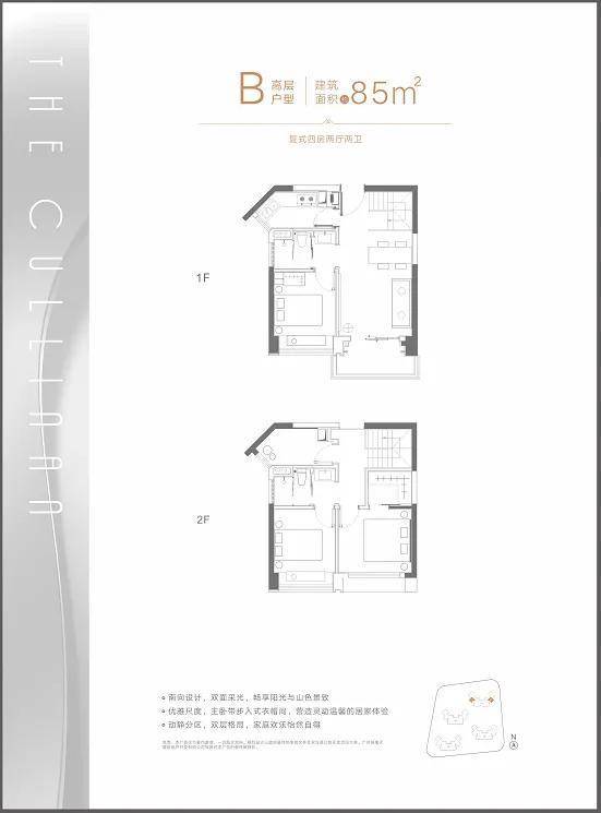 总建筑面积约10.6万㎡,设有4栋高层复式洋房,建面为85-120㎡,采用错式排布,全南向设计,通风采光俱佳,带精装交楼。