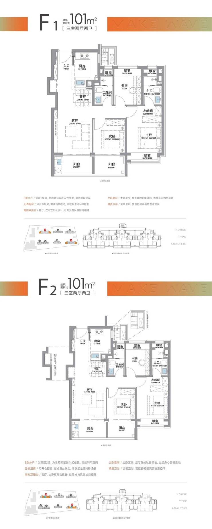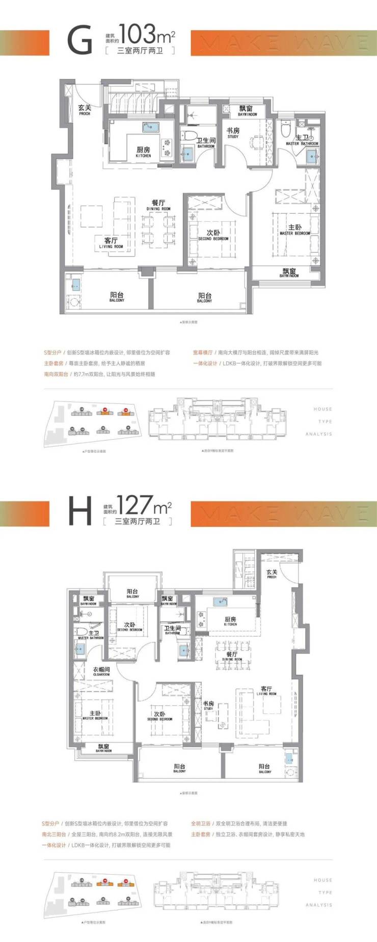 南、北次卧均连接阳台,让每一处栖居空间皆舒适有度(约127㎡户型)