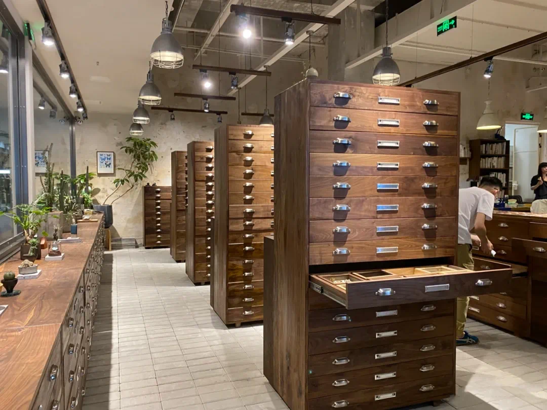 但这个标本博物馆并不是只能单向输出,人们需要像开盲盒一样,一个个拉开柜子查看内容,体验感既新鲜又惊喜,顾客也可以带来自己旅途中获得的落叶、树枝、花瓣、果实......主理人会把他们变成别具意义和价值的艺术品。