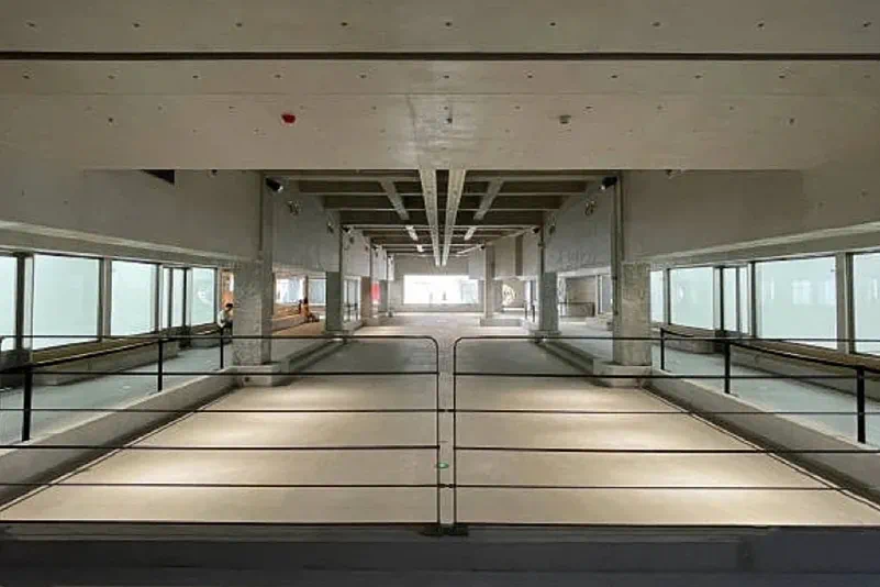 平淡的灰空间,有设计为顶面灯饰的天井,以蓝橙色光源作局部点缀。望向室外的绿树白墙,则时刻提醒你身处一座公园的地下空间。